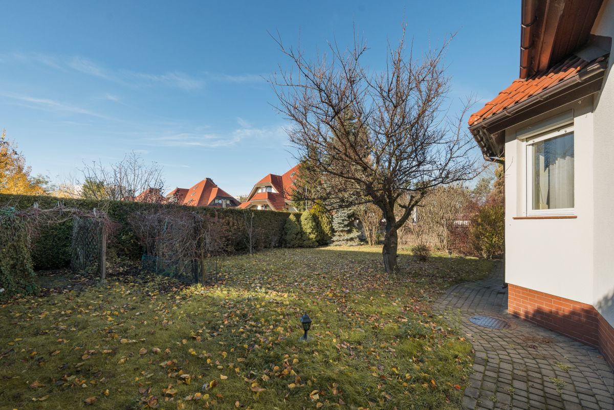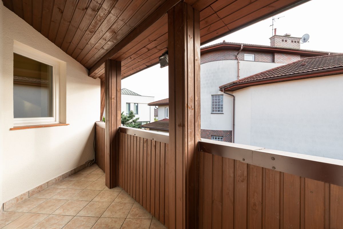 Do nieruchomości przynależy garaż w bryle budynku na dwa samochody oraz podjazd mieszczący dodatkowe auta. Z salonu prowadzi wyjście na taras z widokiem na ogród — idealne miejsce na poranną kawę lub letnie kolacje w gronie bliskich. Dom posiada ogrzewanie gazowe (piec dwufunkcyjny), ogrzewanie podłogowe w kuchni i łazienkach, drewniane okna oraz liczne szafy w zabudowie. Całość otoczona jest bujną roślinnością z pięknie zadbanym trawnikiem oraz żywopłotem.