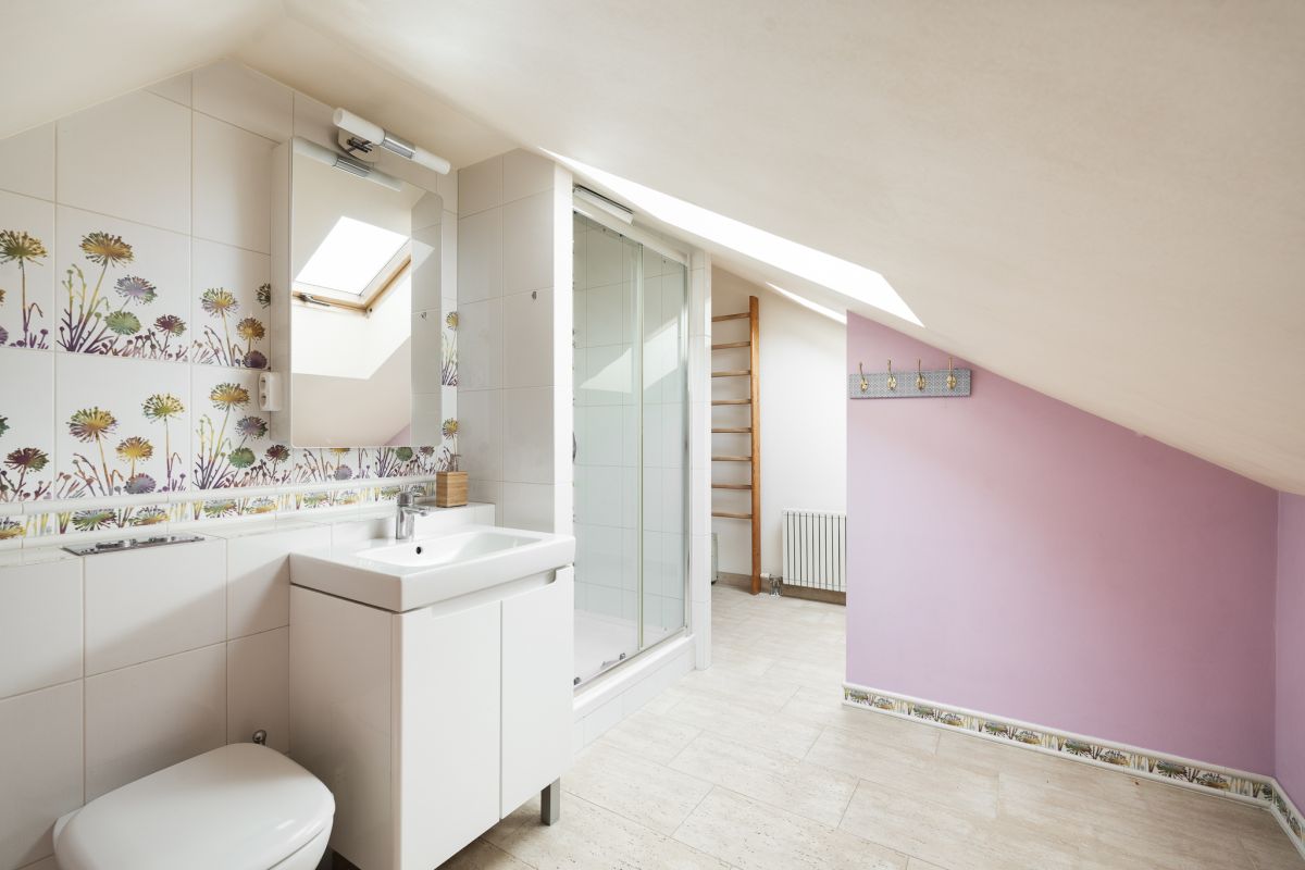 Na piętrze zaprojektowano sypialnię główną z widokiem na ogród, pokój dziecięcy, dodatkowy pokój, które mogą pełnić funkcję gabinetów terapeutycznych lub pracowni, garderobę, łazienkę z wanną i prysznicem oraz otwartą przestrzeń do dowolnej aranżacji - na przykład kącik relaksu, biblioteczkę lub przestrzeń do ćwiczeń.