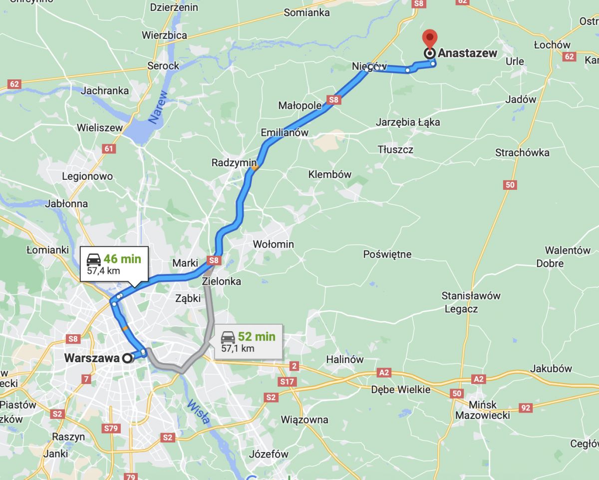 Najbliższe sklepy, szkoła i przedszkole znajdują się w odległości około 5 km - w Zabrodziu, gdzie mieści się również urząd gminy. Do Wyszkowa można dojechać w zaledwie 15 minut, a do Jadowa w około 15 km. W odległości 14 km znajduje się rodzinny park wodny Summer Playground, który w sezonie letnim przyciąga miłośników wodnych atrakcji.