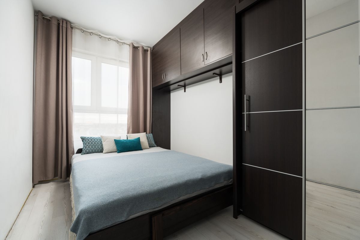 - Sypialnia z dużym oknem, wyposażona w łóżko i pojemną zabudowę.