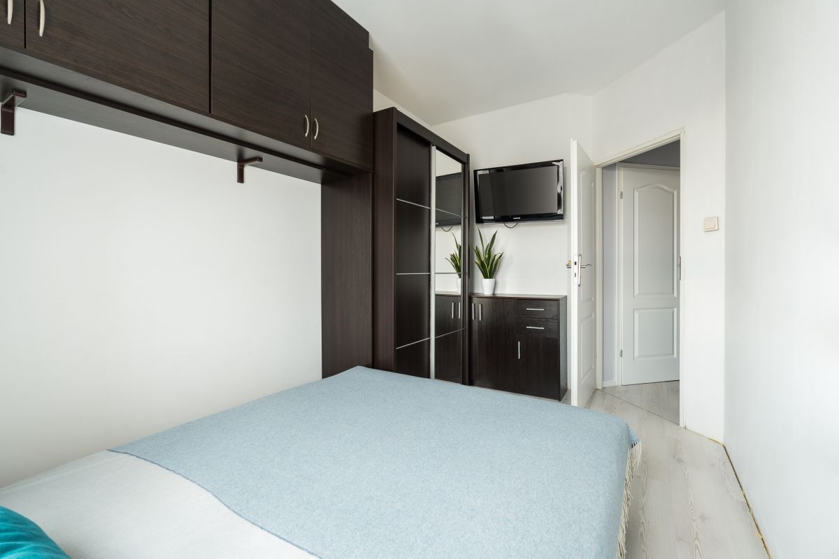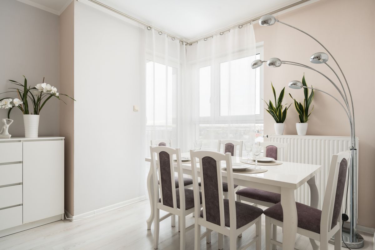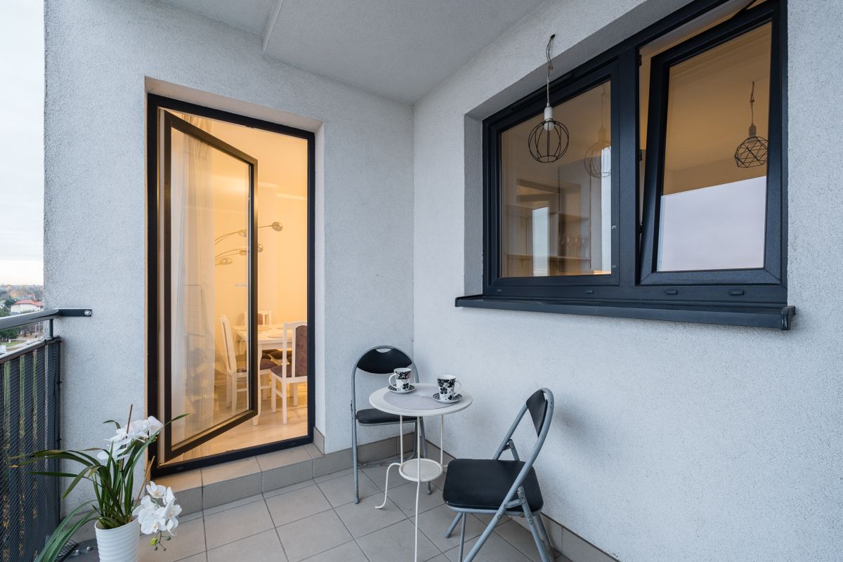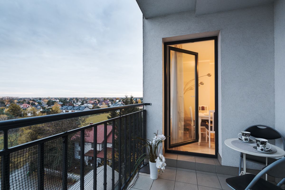 - Ustawny salon z wyjściem na balkon, z którego rozciąga się widok na niską zabudowę Piastowa. Przestrzeń sprzyja wypoczynkowi i daje wiele możliwości aranżacyjnych.