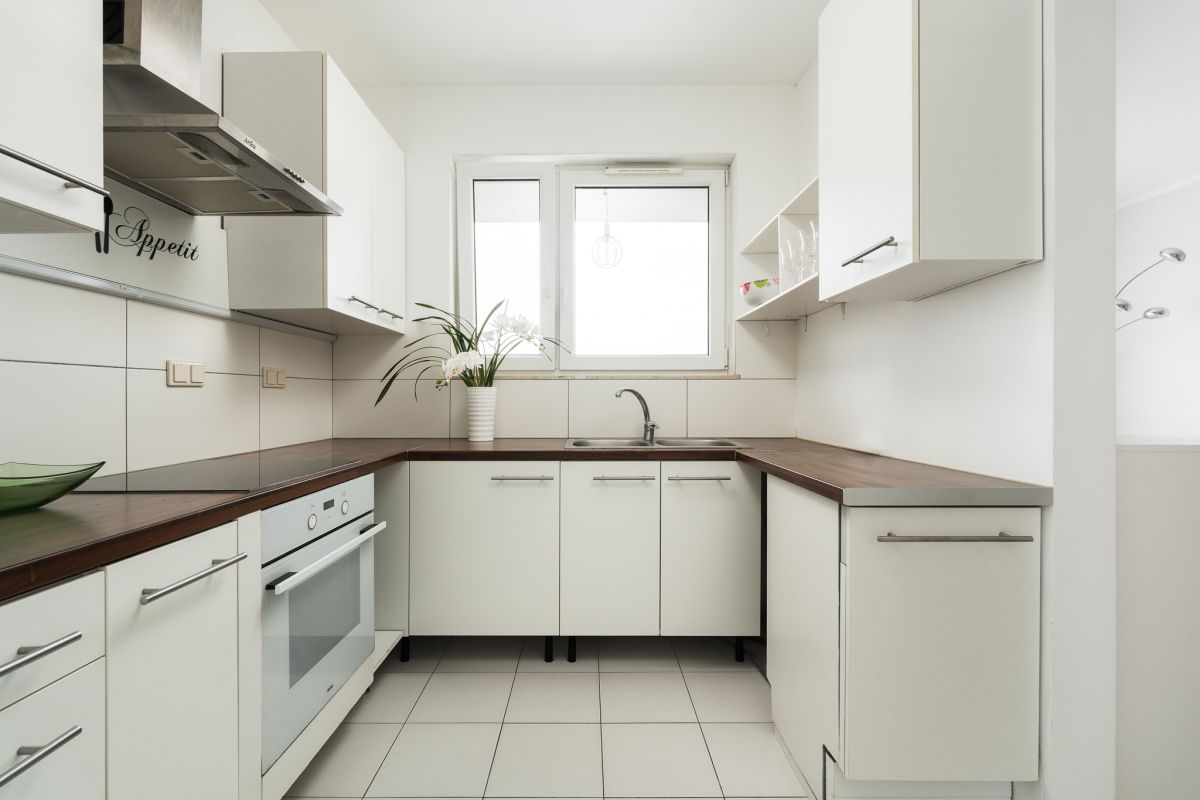 - Oddzielna, widna kuchnia z ergonomicznie rozplanowanymi blatami i szafkami. Duże okno wprowadza do wnętrza naturalne światło.