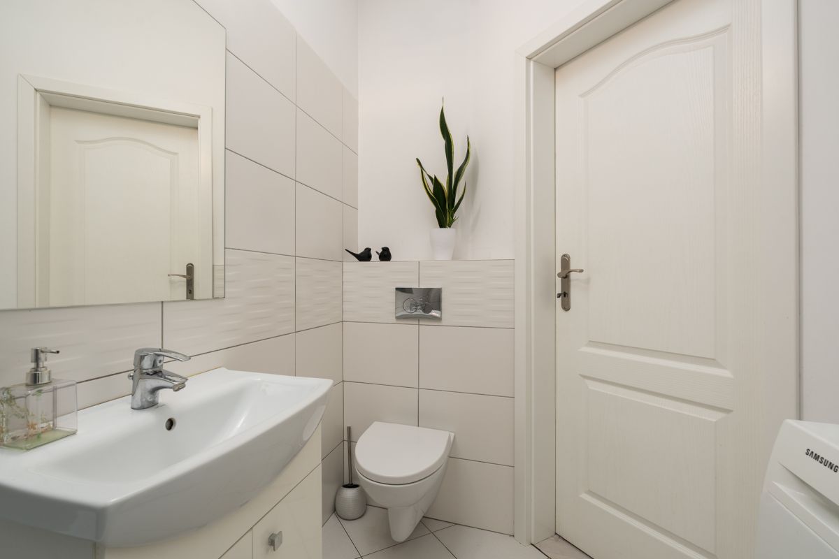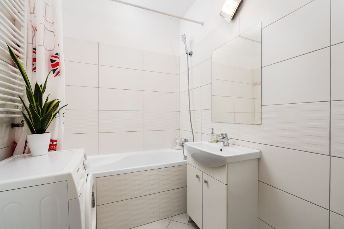 - Łazienka wyposażona w wannę, umywalkę z szafką, WC oraz pralkę.