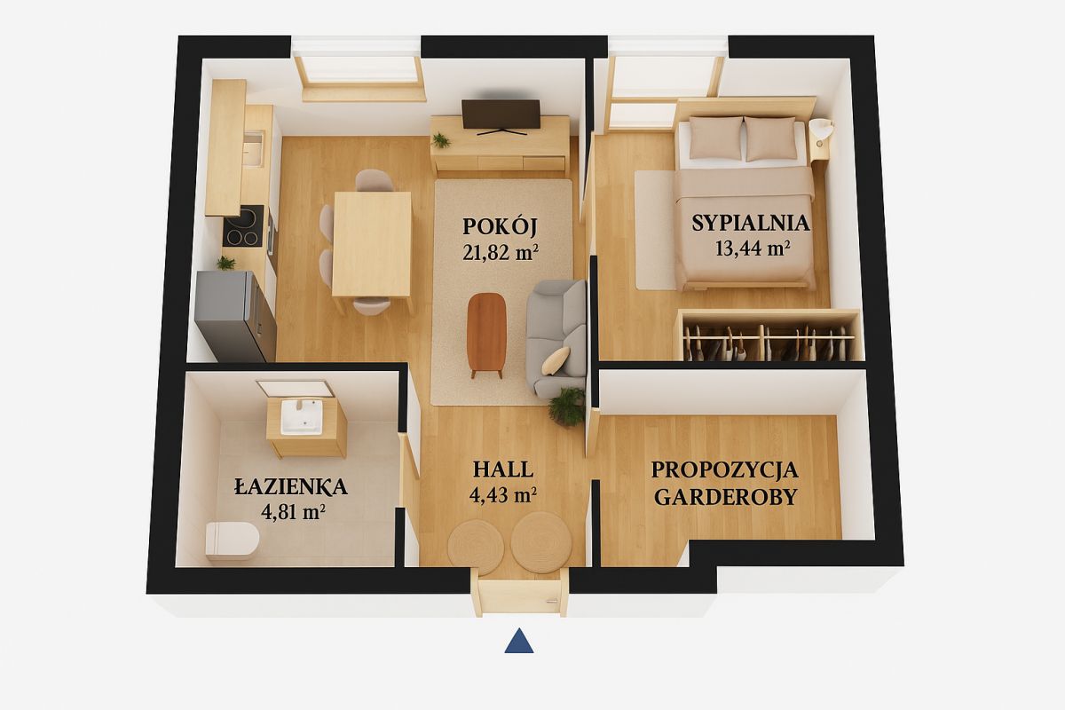 Układ mieszkania daje wiele możliwości - nowy nabywca może w prosty sposób wydzielić pełnowymiarową sypialnię oraz niewielką garderobę, zachowując przy tym otwarty, nowoczesny charakter wnętrza.