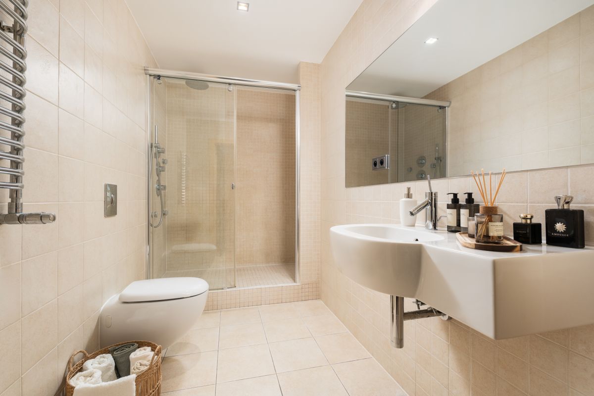 Do dyspozycji pozostaje również łazienka z prysznicem i toaletą oraz osobna dodatkowa toaleta — obie w stonowanej stylistyce, zaprojektowane z myślą o komforcie i funkcjonalności.