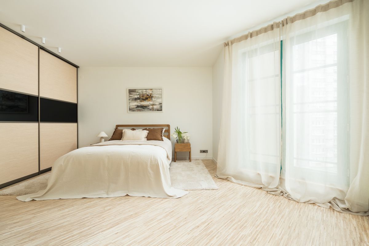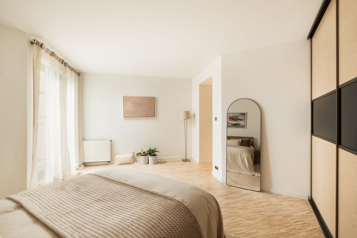 Sypialnia, z ekspozycją południowo-zachodnią, przez większą część dnia skąpana jest w naturalnym świetle, które podkreśla jasne, eleganckie wykończenie. Wykonana na zamówienie zabudowa oraz meble stworzone przez polską manufakturę nadają jej szlachetności i ciepła.