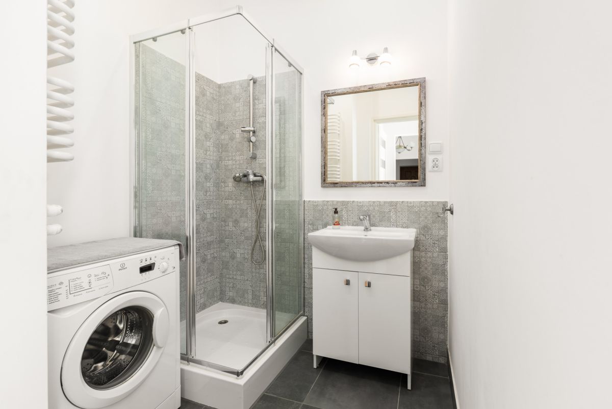 Oczywiście nie zabrakło łazienki z prysznicem i pralką oraz osobnej toalety.
