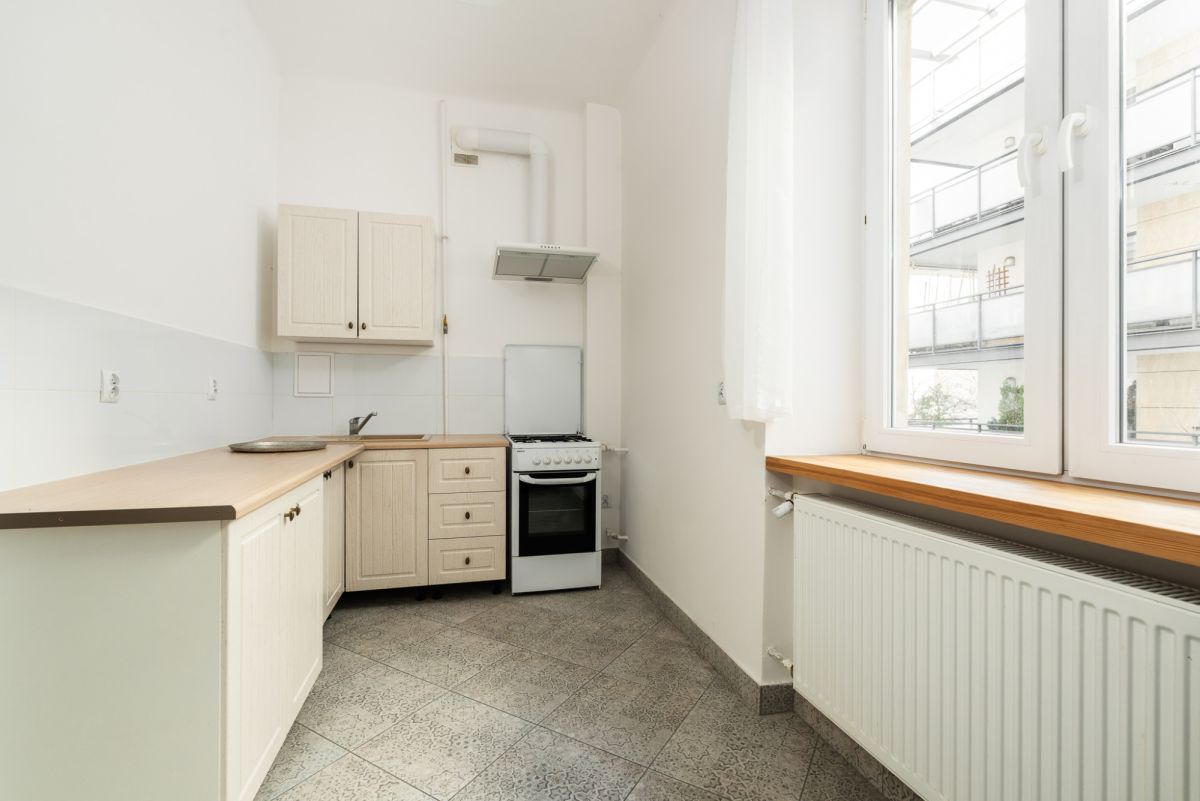 Jasna kuchnia z oknem i sąsiadujące z nią dodatkowe pomieszczenie dają szerokie możliwości aranżacji - od aneksu socjalnego po archiwum lub mały gabinet, a być może jadalnię.