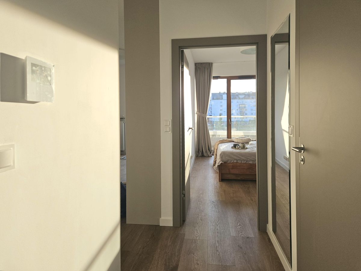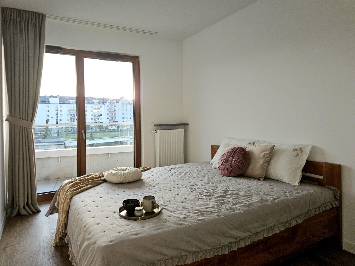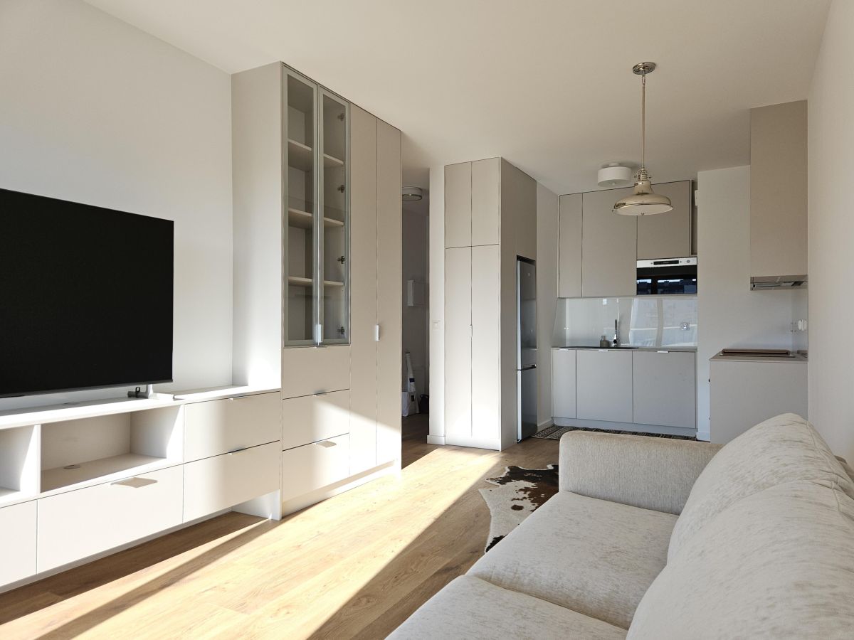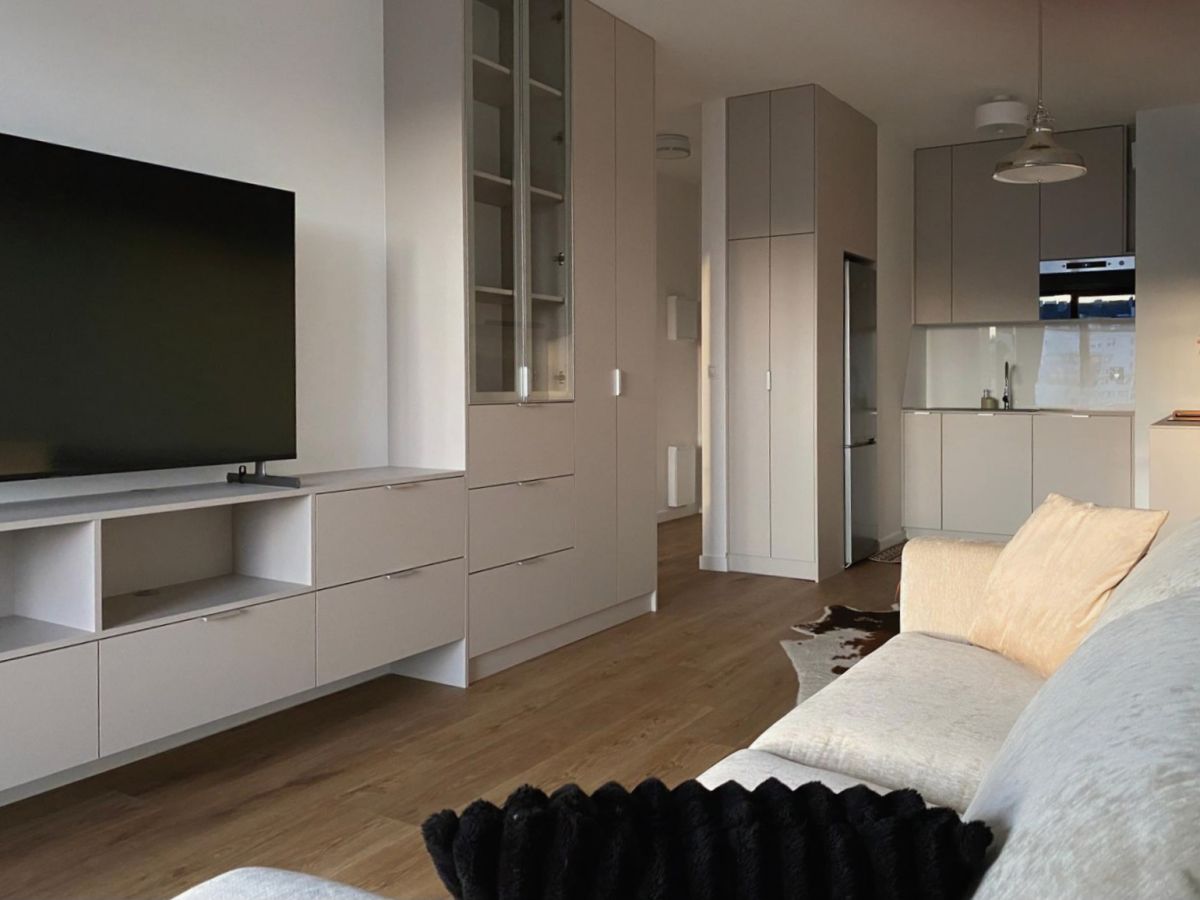 Przestrzeń została zaprojektowana z dbałością o każdy detal i wykończona przy użyciu materiałów najwyższej jakości. Klimatyzowany salon z aneksem kuchennym jest jasny, przestronny i pełen naturalnego światła dzięki panoramicznym oknom, a bezpośrednie wyjście na balkon nadaje wnętrzu dodatkowej funkcjonalności. Nowoczesna, elegancka kuchnia została wyposażona w zabudowę oraz fabrycznie nowy sprzęt AGD, który czeka na swojego pierwszego użytkownika. Przytulna sypialnia również posiada wyjście na balkon, co dodaje uroku i wygody, a stylowa łazienka z wysokiej klasy armaturą została zaprojektowana w ponadczasowym, eleganckim stylu. Umeblowanie zostanie wkrótce uzupełnione o szafki nocne w sypialni oraz stół z krzesłami, który subtelnie oddzieli część kuchenną od strefy dziennej.